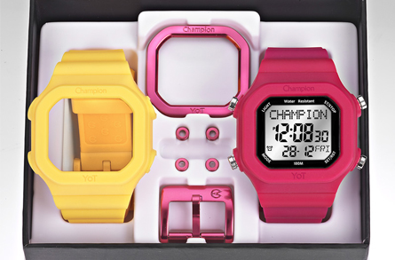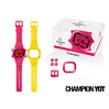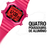 Kit com 2 pulseiras de silicone, 1 aro de alumínio, 1 fivela de alumínio e 4 “poussoir” (anel colorido do botão) de alumínio.